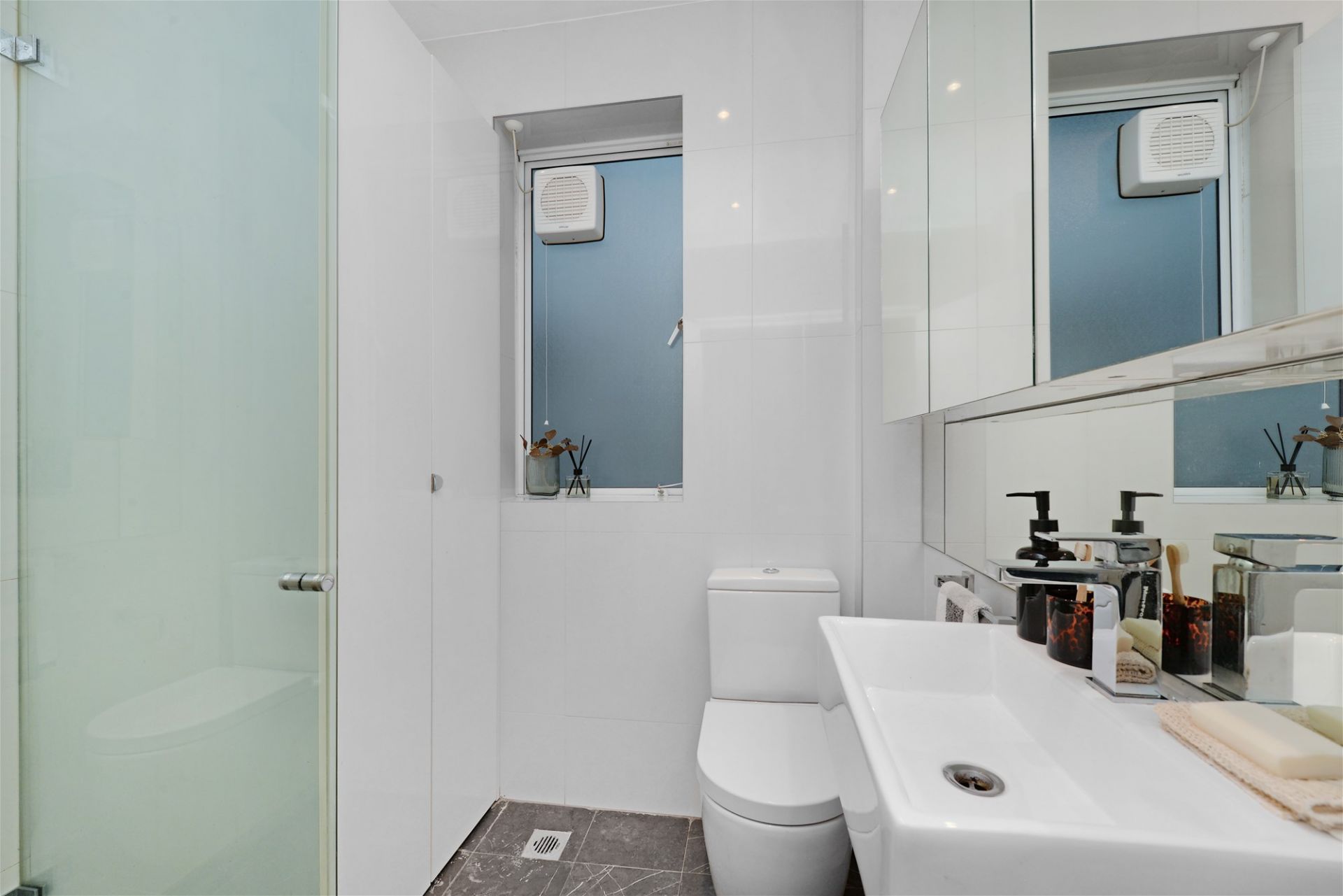 Sleek fully tiled bathroom walk-in shower
