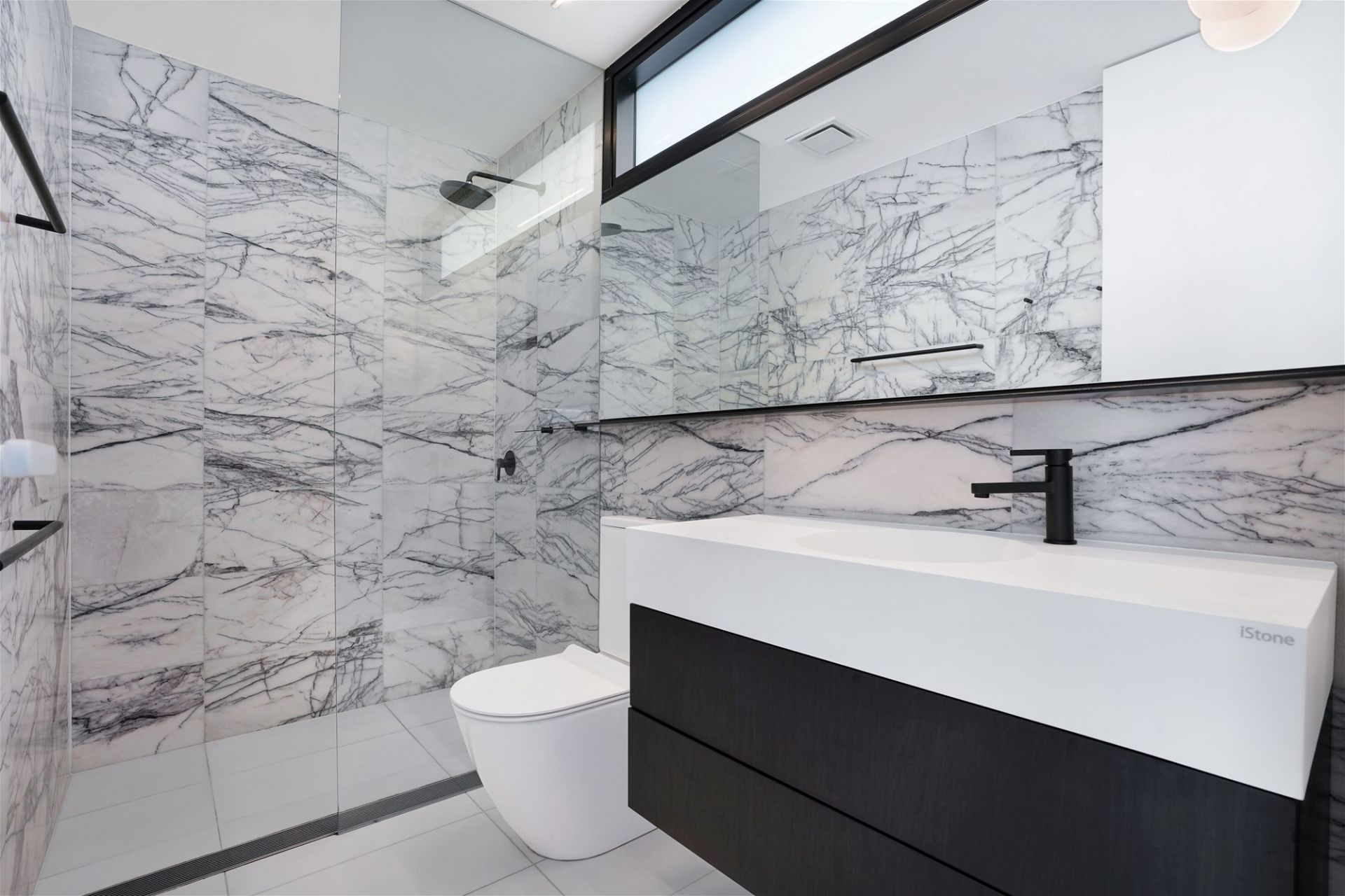 Marble bathroom with large walk-in rain shower